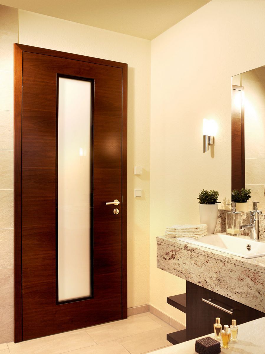 Moderne Innentür aus Nussbaum mit flächenbündigem Lichtausschnitt
